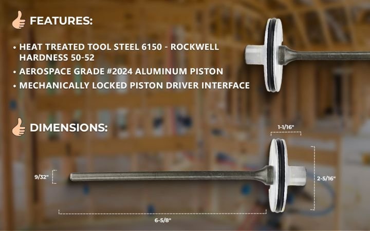 Superior Parts SP 888-033 Aftermarket Piston Driver for Hitachi NV90AG. Aluminum is crimped into the UNI-LOK grooves of the shaft to prevent unscrewing. The UNI-LOK piston driver is designed to ensure that our Piston Driver Assembly remains securely fastened and guaranteed to never unscrew.