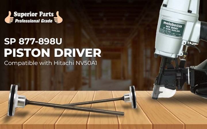 Superior Parts SP 877-898U Aftermarket Piston Driver for Hitachi NV50A1 (Premium US S7 Steel). This is a generic replacement driver with o-ring for the Hitachi NV50A1. The UNI-LOK piston driver is designed to ensure that our Piston Driver Assembly remains securely fastened and guaranteed to never unscrew.. Aluminum is crimped into the UNI-LOK grooves of the shaft to prevent unscrewing. Hardened steel lock tite and micro-mechanically locked piston driver interface.